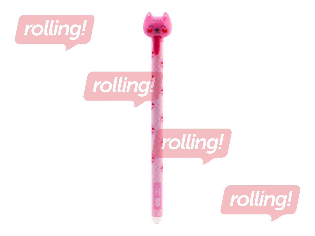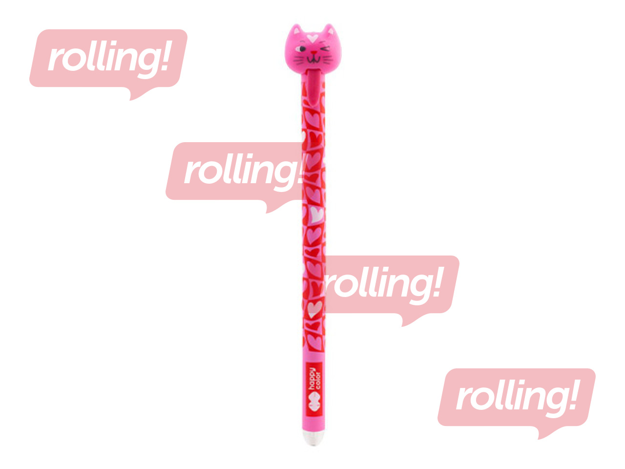 Kustutatav geelpliiats naljakate kassimotiividega pöörleval korgikorpusel kassifännidele.