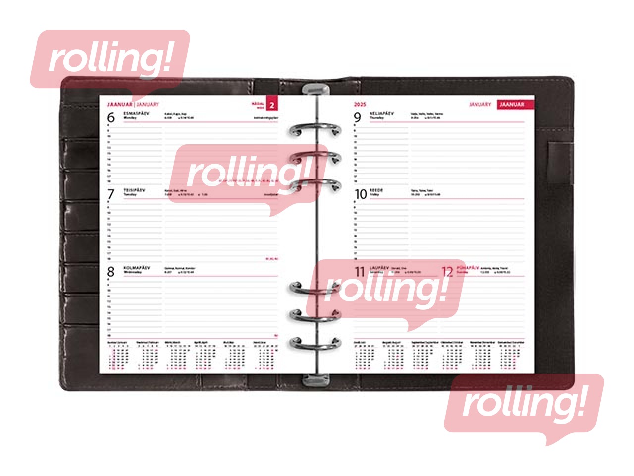 Kunstnahast kaantega 6 rõngaga nädalakalender. Rõngaste kaugused tsentrist tsentrisse 19-19-70-19-19 mm. Lk. mõõt 142x202 mm. Trukiga kinnitus. Esikaane siseküljel 7 krediitkaarditaskut ja tõmblukuga tasku. Tagakaane siseküljel märkmeploki tasku ja pliiatsihoidja. Kalendaarium sisaldab riigipühi, riiklikke ja rahvakalendri tähtpäevi, lipupäevi, nimepäevi, 42 riigi pühi lühenditena, päikese tõusu ja loojangu aegu, kuu faase, aastaaegade alguseid, käesoleva ja järgneva aasta plaane, aasta tabelkalendreid, foneetilisi tähestikke, mõõtühikute teisendamise tabelit ja tabeleid enamuse maailma riikide telefoni koodide, valuuta, ajavahe jne kohta, 16 lk Eesti kaarti.. Komplekti kuulub must plastregister, telefonilehed, ruudulised märkmelehed, visiitkaarditaskud.