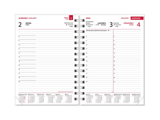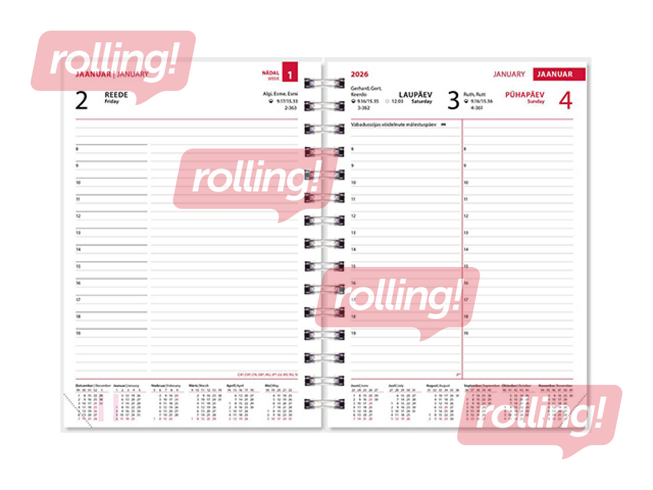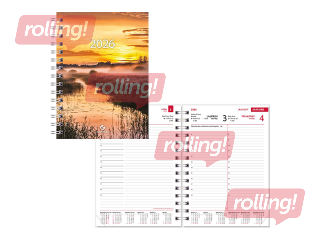 Päevajaotusega spiraalköites kalendri sisu, lk. mõõt 142x202 mm. Kalendaarium sisaldab riigipühi, riiklikke ja rahvakalendri tähtpäevi, lipupäevi, nimepäevi, 42 riigi pühi lühenditena, päikese tõusu ja loojangu aegu, kuu faase, aastaaegade alguseid, käesoleva ja järgneva aasta plaane, aasta tabelkalendreid, foneetilisi tähestikke, mõõtühikute teisendamise tabelit ja tabeleid enamuse maailma riikide telefoni koodide, valuuta, ajavahe jne kohta.