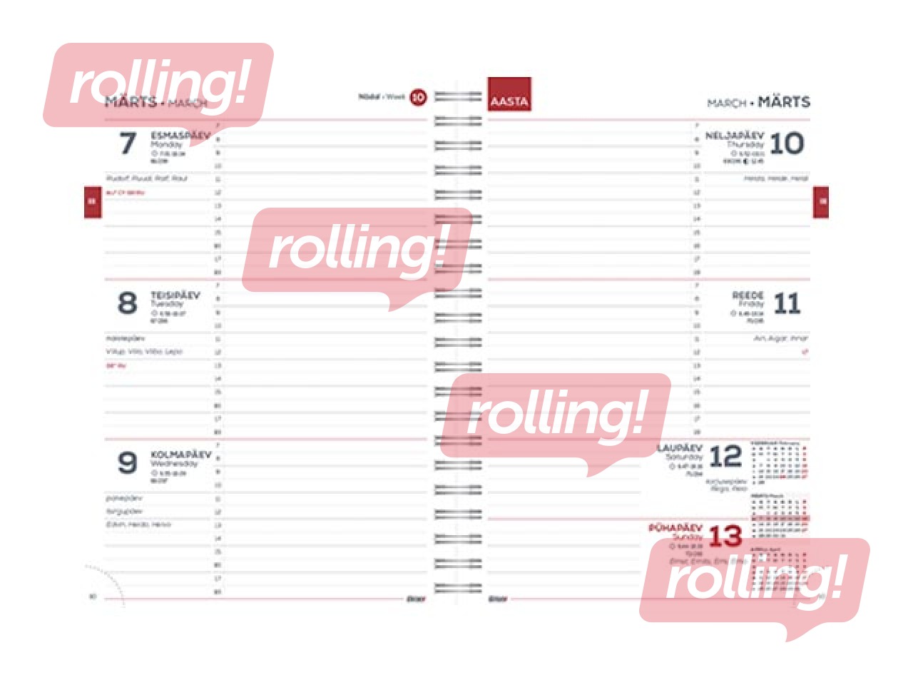 riigipühad, riiklikud ja rahvakalendri tähtpäevad, lipu- ja nimepäevad, 38 riigi riigipühad lühenditega, päikese tõusu ja loojangu kellaajad (Tallinn), suve- ja talveajale üleminek, kuu faasid kellaaegadega, sodiaagimärkide algused, päevaloend, minikalender, nädala number, aastaaegad algused, kellaajad. Lisalehtedel aastaplaan (3 kuud lehel), puhkuse planeerija, linnadevahelised kaugused, kaugvalimiskoodid, maailma ajad, mõõtühikute teisendamine, rõivaste ja jalatsite suurusnumbrid, tabelkalender, märkmelehed.