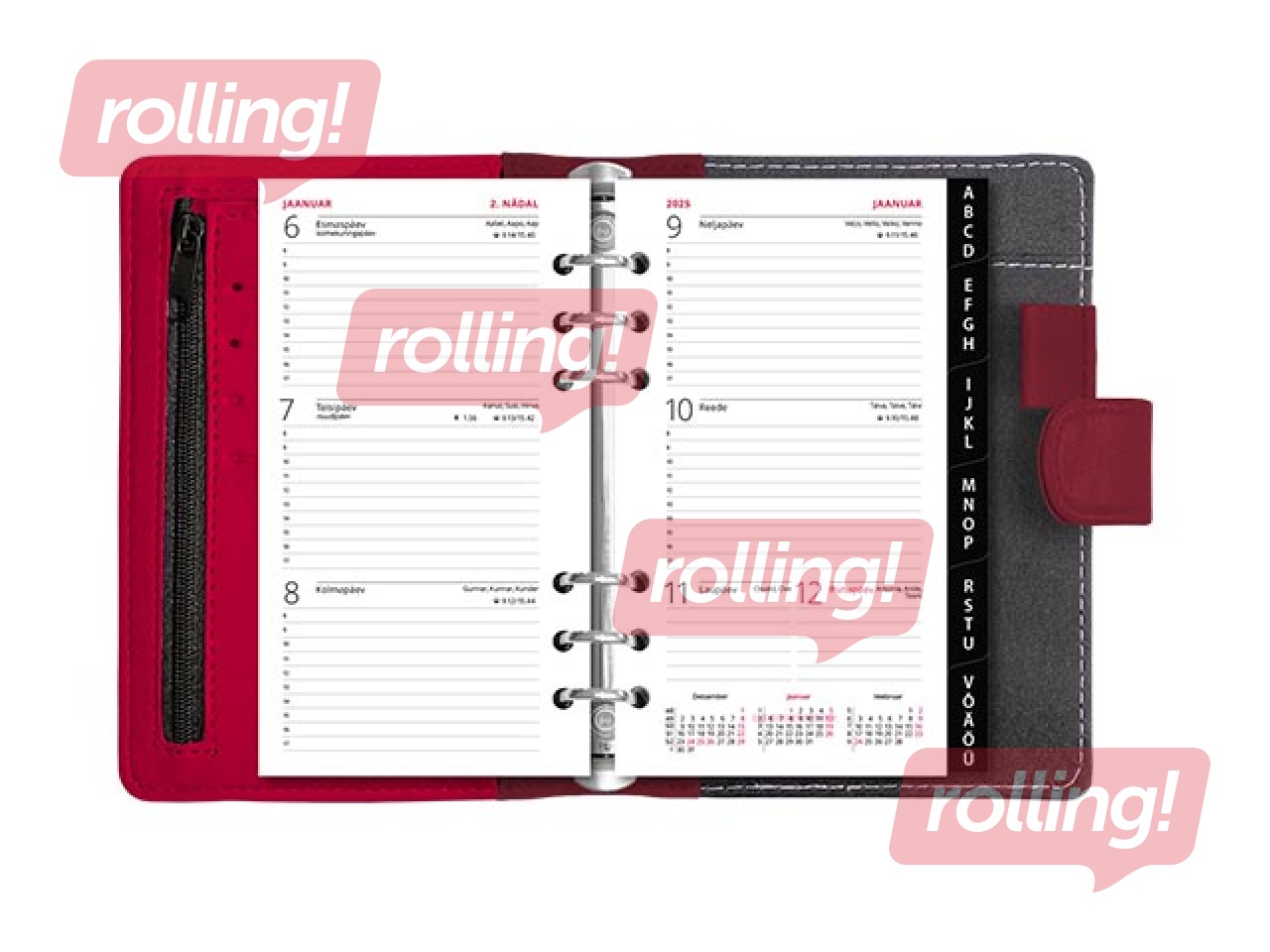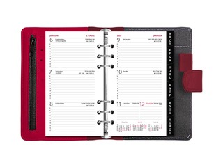 Kunstnahast kaantega 6 rõngaga nädalakalender. Rõngaste kaugused tsentrist tsentrisse 19-19-50-19-19 mm. Lk. mõõt 93x170 mm. Trukiga kinnitus. Esikaane siseküljel 4 krediitkaarditaskut ja tõmblukuga tasku. Tagakaane siseküljel märkmeploki tasku ja pliiatsihoidja. Kalendaarium sisaldab riigipühi, riiklikke ja rahvakalendri tähtpäevi, lipupäevi, nimepäevi, 42 riigi pühi lühenditena, päikese tõusu ja loojangu aegu, kuu faase, aastaaegade alguseid, käesoleva ja järgneva aasta plaane, aasta tabelkalendreid, foneetilisi tähestikke. Komplekti kuulub must plastregister, telefonilehed, ruudulised märkmelehed, visiitkaarditaskud.