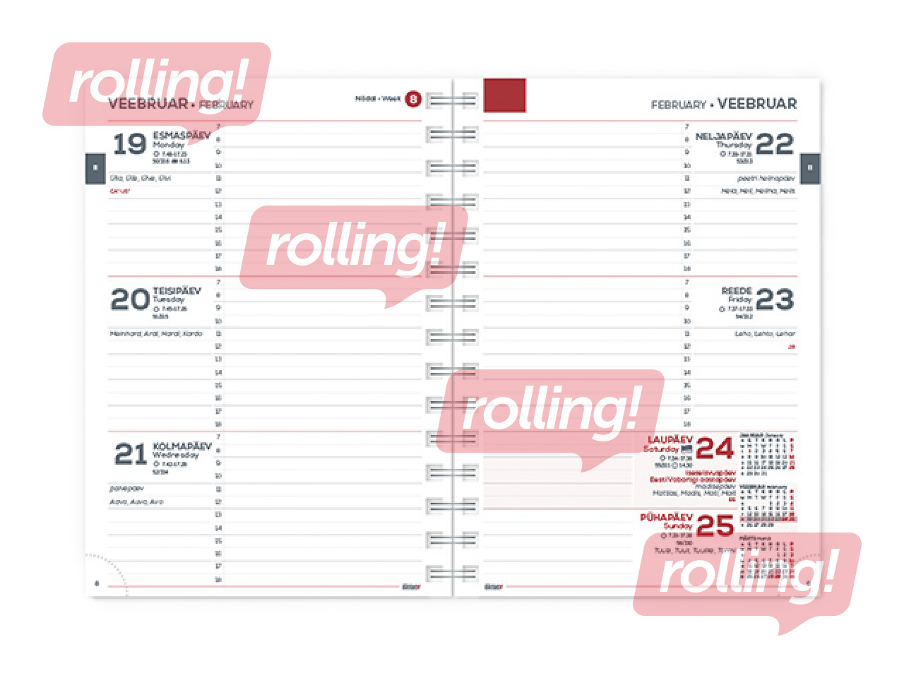Riigipühad, riiklikud ja rahvakalendri tähtpäevad, lipu- ja nimepäevad, kaduneljapäevad, suve- ja talveajale üleminek, 37 riigi riigipühad lühenditega, päikese tõusu ja loojangu kallaajad (Tallinn), kuu faasid kellaaegadega, sodiaagimärkide algused, päevaloend, minikalender, nädala number, aastaaegade algused, kellaajad. Lisalehtedel aastaplaan (2 kuud lehel), puhkuse planeerija, linnadevahelised kaugused, kaugvalimiskoodid, maailma ajad, mõõtühikute teisendamine, tabelkalender, märkmelehed, kalendri legend.