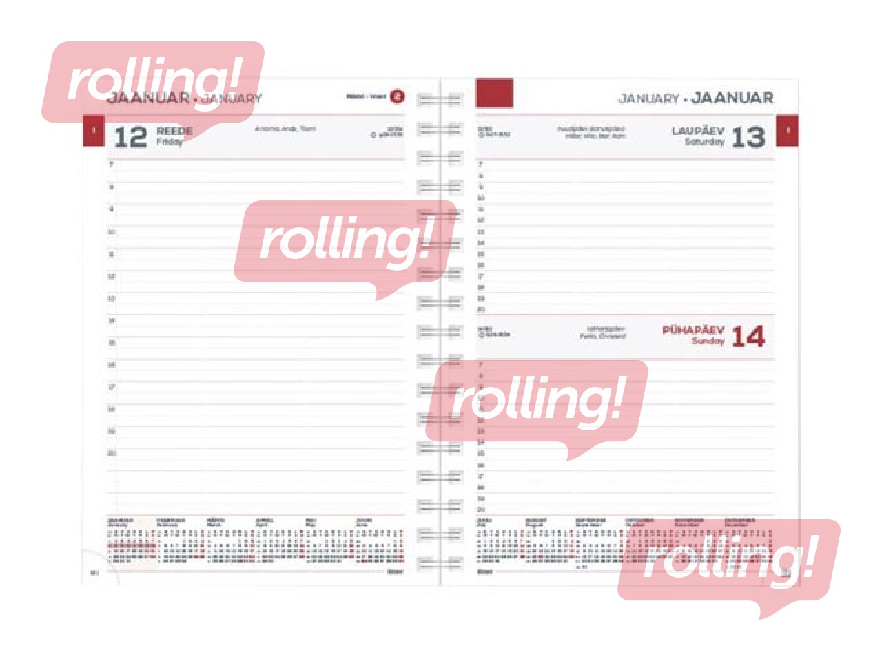 Lisalehtedel on aastaplaan (2 kuud lehekülje kohta), puhkuseplaan, linnadevahelised kaugused, suunakoodid, maailma ajavööndid, riigipühad, märkmelehed ja kontaktide lehed.