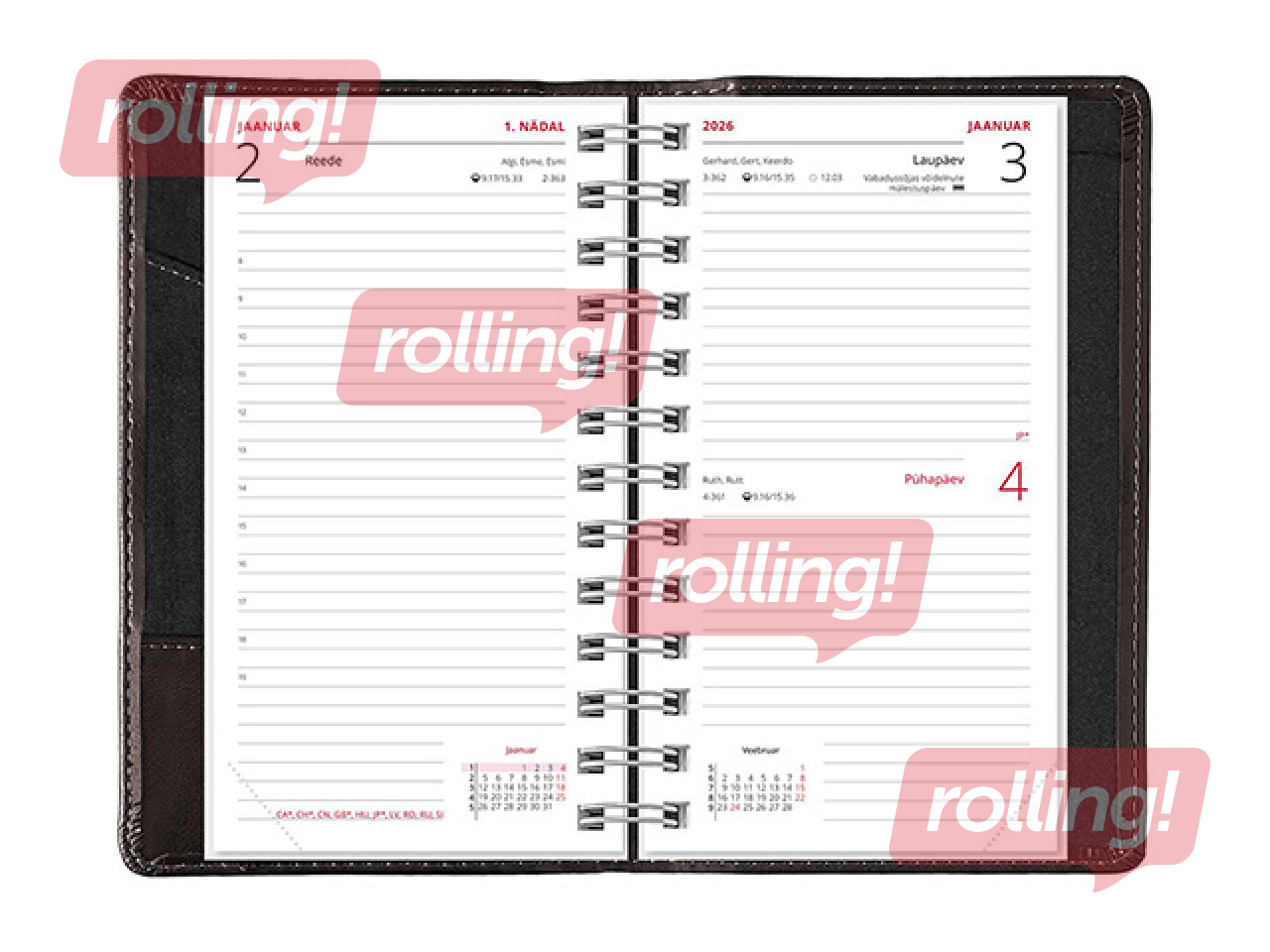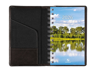 Kunstnahast kaante ja päevajaotusega spiraalköites kalender, lk. mõõt 93x170 mm. Trukiga kinnitus. Kalendaarium sisaldab riigipühi, riiklikke ja rahvakalendri tähtpäevi, lipupäevi, nimepäevi, 42 riigi pühi lühenditena, päikese tõusu ja loojangu aegu, kuu faase, aastaaegade alguseid, käesoleva ja järgneva aasta plaane, aasta tabelkalendreid, foneetilisi tähestikke. Pliiatsihoidja.