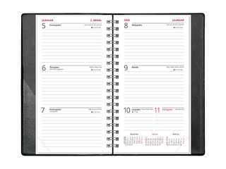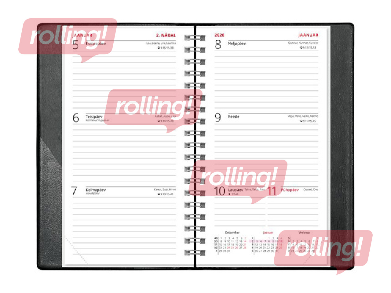 Plastkaante ja nädalajaotusega spiraalköites kalender, lk. mõõt 93x170 mm. Kalendaarium sisaldab riigipühi, riiklikke ja rahvakalendri tähtpäevi, lipupäevi, nimepäevi, 42 riigi pühi lühenditena, päikese tõusu ja loojangu aegu, kuu faase, aastaaegade alguseid, käesoleva ja järgneva aasta plaane, aasta tabelkalendreid, foneetilisi tähestikke.