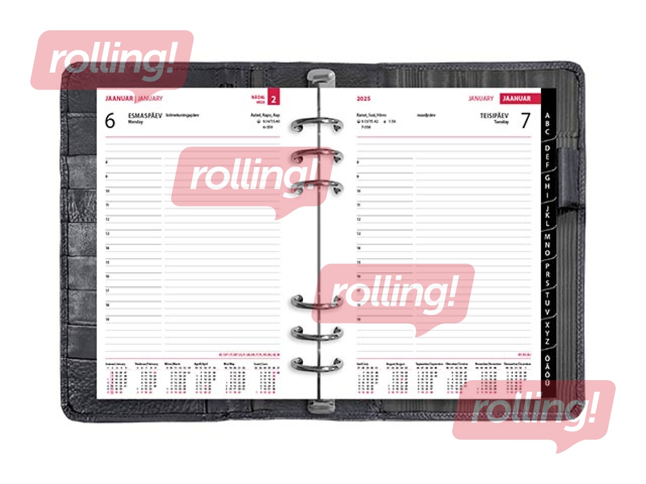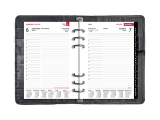 Täisnahast kaantega 6 rõngaga päevaakalender. Rõngaste kaugused tsentrist tsentrisse 19-19-70-19-19 mm. Lk. mõõt 142x202 mm. Trukiga kinnitus. Esikaane siseküljel 7 krediitkaarditaskut ja tõmblukuga tasku. Tagakaane siseküljel märkmeploki tasku ja pliiatsihoidja. Kalendaarium sisaldab riigipühi, riiklikke ja rahvakalendri tähtpäevi, lipupäevi, nimepäevi, 42 riigi pühi lühenditena, päikese tõusu ja loojangu aegu, kuu faase, aastaaegade alguseid, käesoleva ja järgneva aasta plaane, aasta tabelkalendreid, foneetilisi tähestikke, mõõtühikute teisendamise tabelit ja tabeleid enamuse maailma riikide telefoni koodide, valuuta, ajavahe jne kohta. Komplekti kuulub must plastregister, telefonilehed, ruudulised märkmelehed, visiitkaarditaskud.