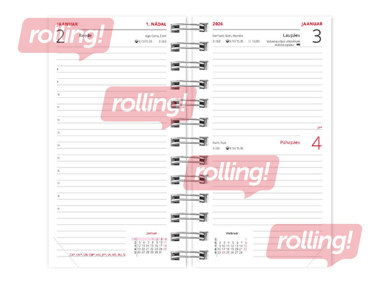 Päevajaotusega spiraalköites kalendri sisu, lk. mõõt 93x170 mm. Kalendaarium sisaldab riigipühi, riiklikke ja rahvakalendri tähtpäevi, lipupäevi, nimepäevi, 42 riigi pühi lühenditena, päikese tõusu ja loojangu aegu, kuu faase, aastaaegade alguseid, käesoleva ja järgneva aasta plaane, aasta tabelkalendreid, foneetilisi tähestikke.