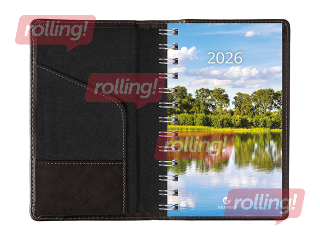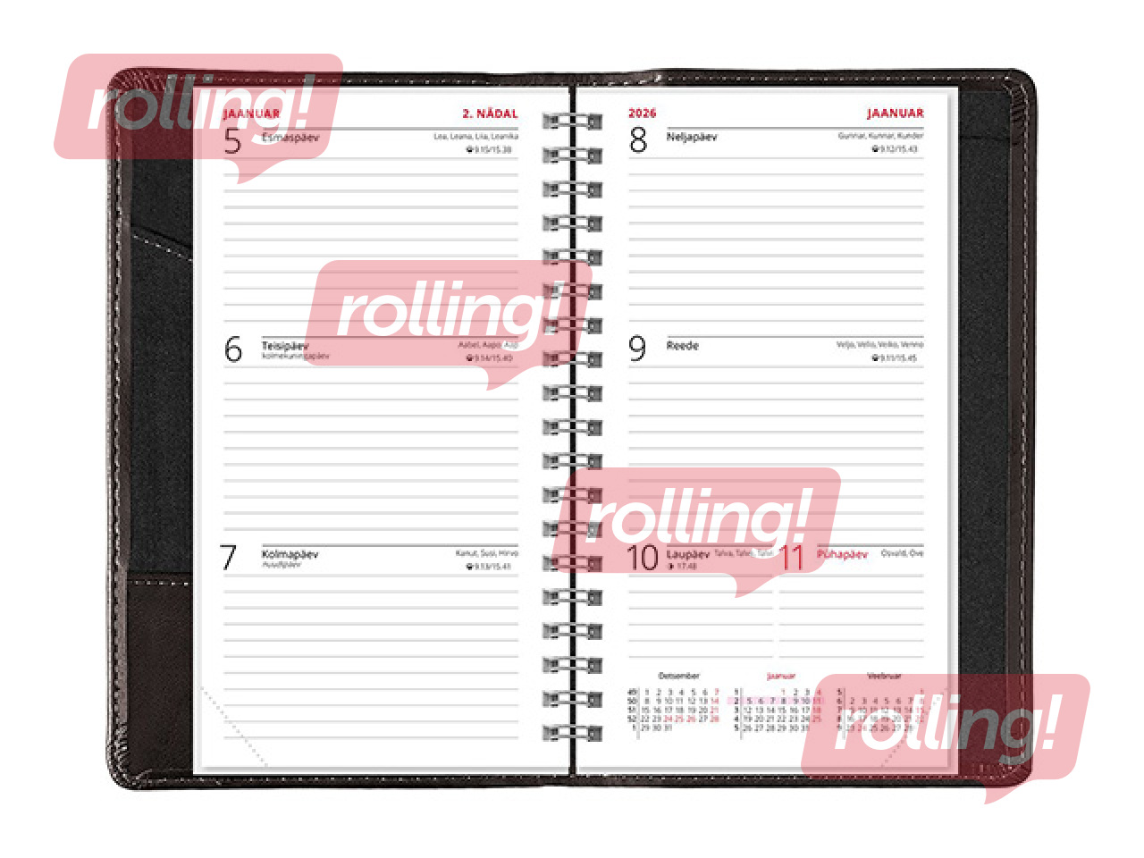 Kunstnahast kaante ja nädalajaotusega spiraalköites kalender, lk. mõõt 93x170 mm. Trukiga kinnitus. Kalendaarium sisaldab riigipühi, riiklikke ja rahvakalendri tähtpäevi, lipupäevi, nimepäevi, 42 riigi pühi lühenditena, päikese tõusu ja loojangu aegu, kuu faase, aastaaegade alguseid, käesoleva ja järgneva aasta plaane, aasta tabelkalendreid, foneetilisi tähestikke. Pliiatsihoidja. Märkmeplokk tagakaane taskus.
