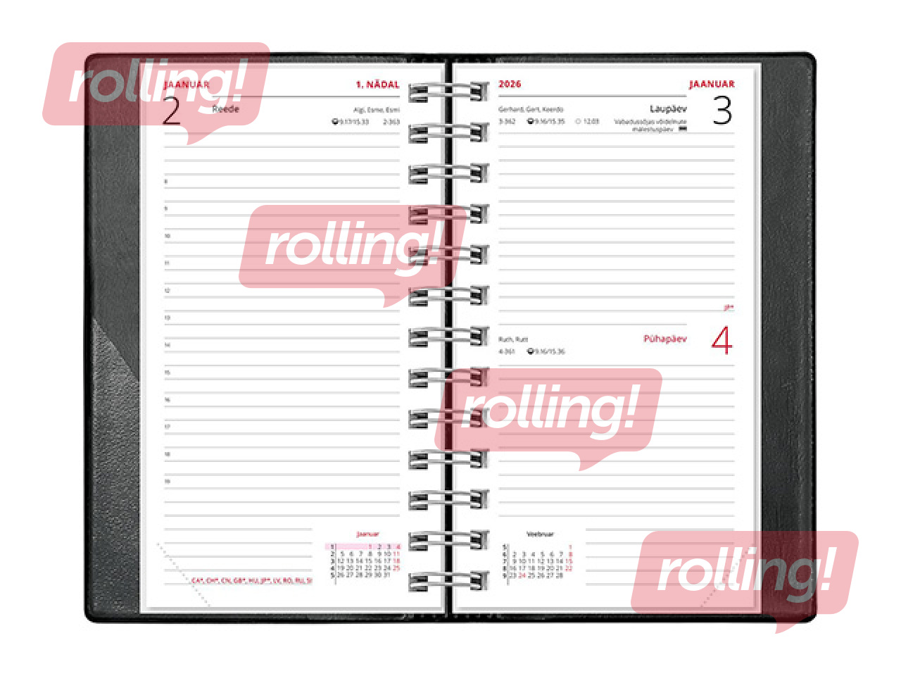 Plastkaante ja päevajaotusega spiraalköites kalender, lk. mõõt 93x170 mm. Kalendaarium sisaldab riigipühi, riiklikke ja rahvakalendri tähtpäevi, lipupäevi, nimepäevi, 42 riigi pühi lühenditena, päikese tõusu ja loojangu aegu, kuu faase, aastaaegade alguseid, käesoleva ja järgneva aasta plaane, aasta tabelkalendreid, foneetilisi tähestikke.