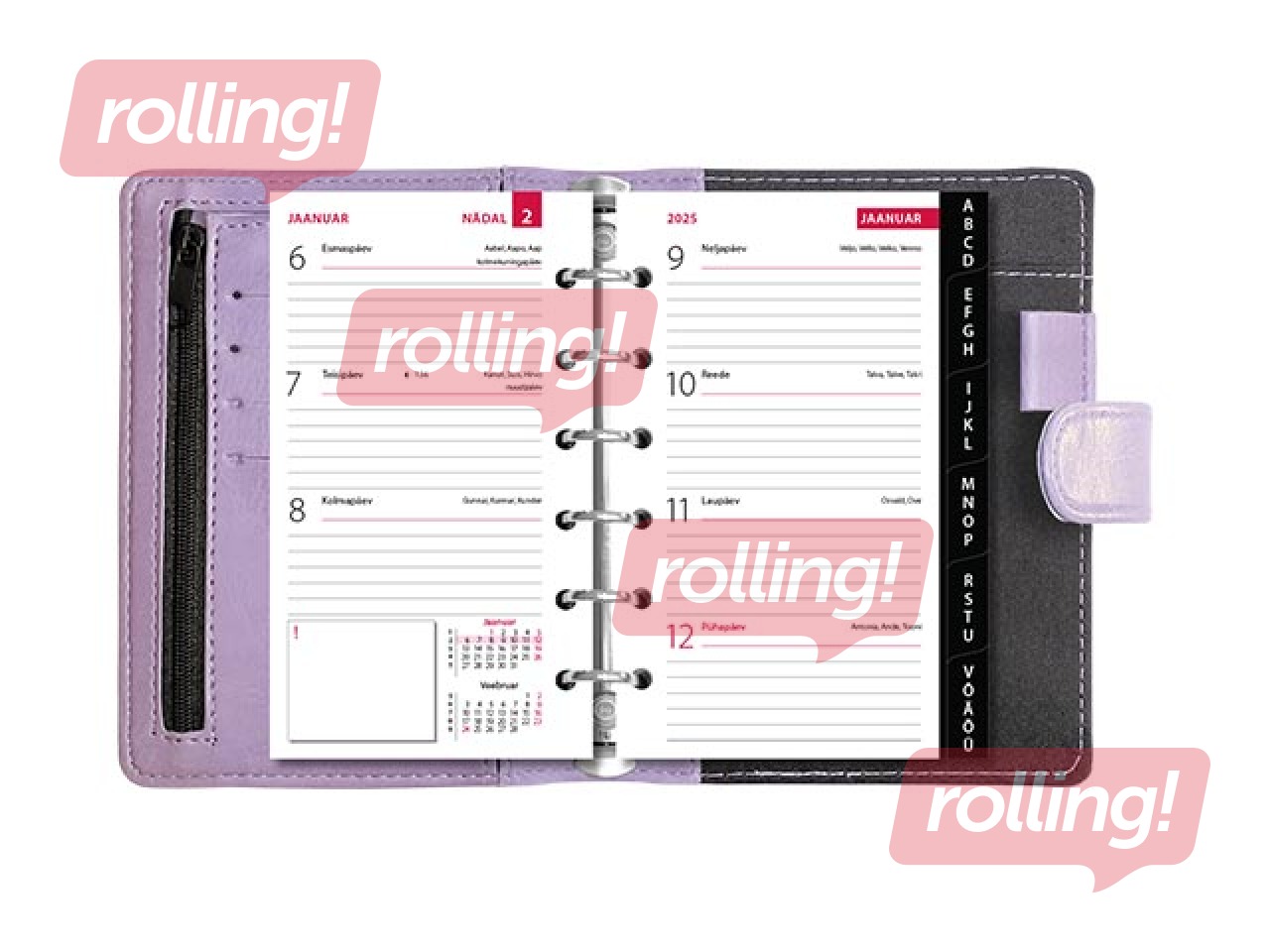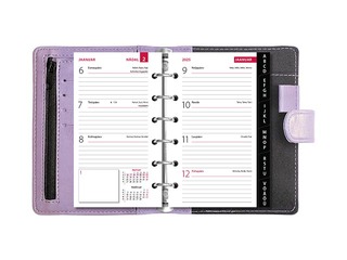 Kunstnahast kaantega 6 rõngaga nädalakalender. Rõngaste kaugused tsentrist tsentrisse 19-19-19-19-19 mm. Lk. mõõt 78x130 mm. Trukiga kinnitus. Esikaane siseküljel 4 krediitkaarditaskut. Tagakaane siseküljel märkmeploki tasku ja pliiatsihoidja. Kalendaarium sisaldab riigipühi, riiklikke ja rahvakalendri tähtpäevi, lipupäevi, nimepäevi, päikese tõusu ja loojangu aegu, kuu faase, aastaaegade alguseid, käesoleva ja järgneva aasta plaane, aasta tabelkalendreid. Komplekti kuulub must plastregister, telefonilehed, ruudulised märkmelehed.