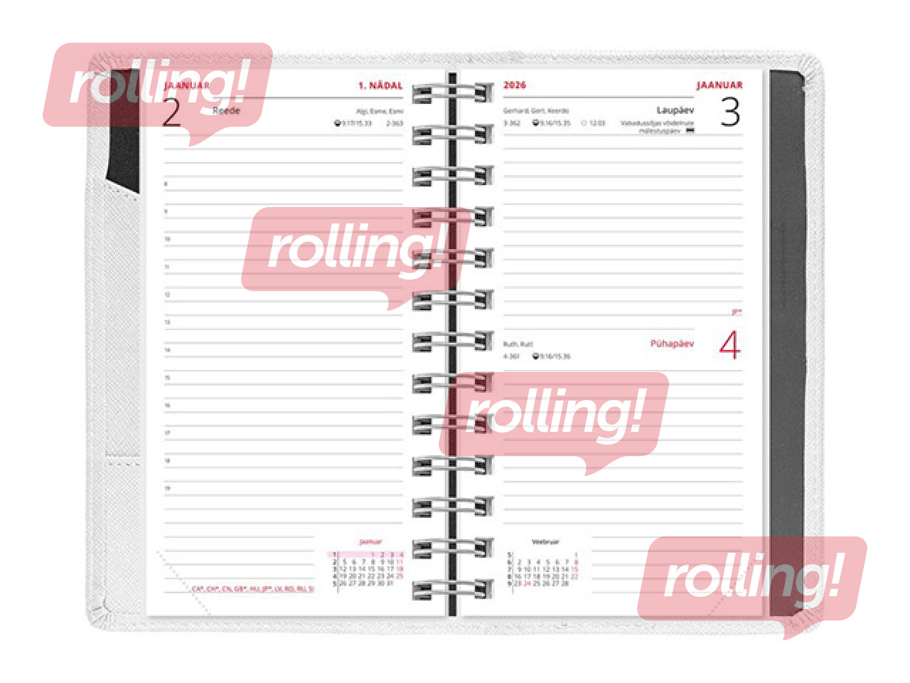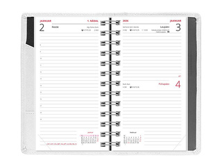Kunstnahast kaante ja päevajaotusega spiraalköites kalender, lk. mõõt 93x170 mm. Trukiga kinnitus. Kalendaarium sisaldab riigipühi, riiklikke ja rahvakalendri tähtpäevi, lipupäevi, nimepäevi, 42 riigi pühi lühenditena, päikese tõusu ja loojangu aegu, kuu faase, aastaaegade alguseid, käesoleva ja järgneva aasta plaane, aasta tabelkalendreid, foneetilisi tähestikke. Pliiatsihoidja.
