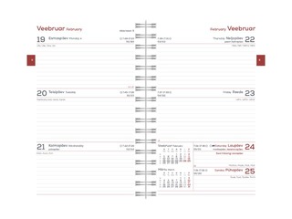 Riigipühad, riiklikud ja rahvakalendri tähtpäevad, päevaloend, lipu- ja nimepäevad, 37 riigi riigipühad lühenditega, päikese tõusu ja loojangu kellaajad (Tallinn), rahvusvaheliste pühade lühendid, kuu faasid kellaaegadega, sodiaagimärgid, minikalender, nädala number, aastaaegade algused kellaaegadega. Lisalehtedel isikuandmed, tabelkalender, aastaplaan, märkmed, linnadevahelised kaugused, maailma ajad, Euroopa Liidu liikmesriigid.