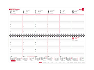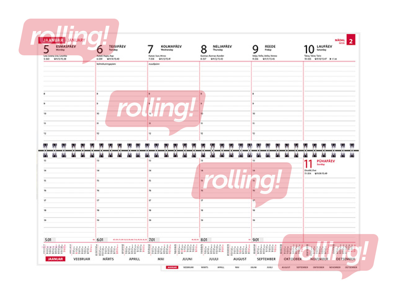Spiraalköites nädalavaate ja vertikaaljaotusega kalender. Lk. mõõt 297x105mm. 0,8mm paksusest plastikust kaaned. Kalendaarium sisaldab riigipühi, riiklikke ja rahvakalendri tähtpäevi, lipupäevi, nimepäevi, 42 riigi pühi lühenditena, päikese tõusu ja loojangu aegu, kuu faase, aastaaegade alguseid, käesoleva ja järgneva aasta plaane.