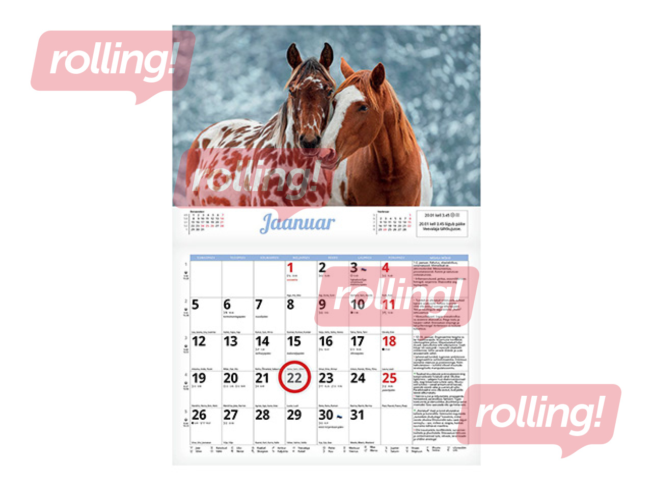 Klamberköites seinakalender, avatud mõõt 297x420 mm. Kalendaarium sisaldab riigipühi, riiklikke ja rahvakalendri tähtpäevi, nimepäevi, lipupäevi, päikese tõusu ja loojangu kellaaegu iga nädala esimesel päeval, kuu faase, aastaaegade alguseid, eelneva ja järgneva kuu kalendreid. Lisaks sisaldab kalender peamisi astroloogilisi sündmusi js nõuandeid iga nädala kohta. Kalendriga on kaasas staatiline kuupäevamärkija.