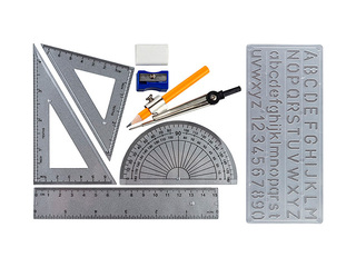 9-osaline joonestuskomplekt, mis sisaldab metallist joonestuskompassi, pliiatsit, kustukummi, teritajat, transportööri, kahte kolmnurka, joonlauda ja šablooni. Kõik vajalik täpseks joonestamiseks ja geomeetriatöödeks.