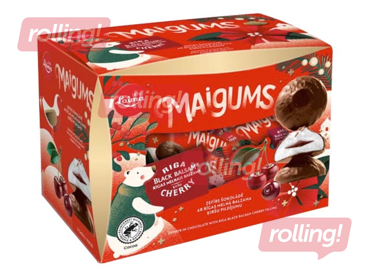 Koostis: suhkur, glükoosisiirup, vesi, õunamoos (õunad 83%, suhkur), kakaomass, kakaovõi, paksendaja karrageen, EGG valgupulber (EGG valgupulber, happesuse regulaatorid (sidrunhape, naatriumkarbonaat), vahuained trietüültsitraat ), lõhna- ja maitseained, happesuse regulaator trinaatriumtsitraat, emulgaator päevalille letsitiinid, musta porgandimahla kontsentraat, kange (alk. 30% vol.) alkohoolne jook Rīgas Melnais Balzams Ķiršu 0,05%. Šokolaadi kakaosisaldus on vähemalt 52%. Võib sisaldada PIIMA, GLUTEENI sisaldava TERVILJA, MAAPÄHKLITE ja muude PÄHKLITE osakesi.