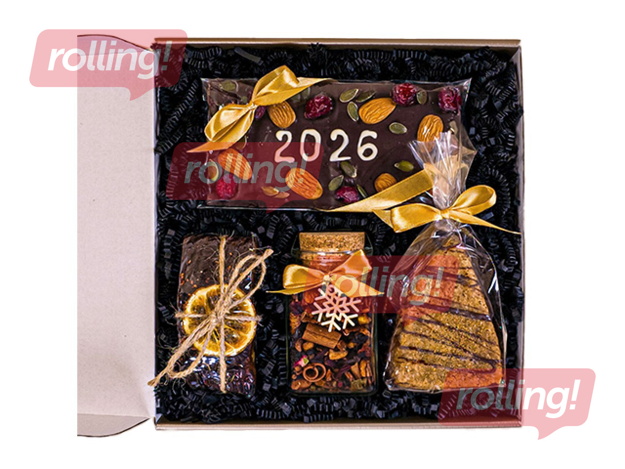 Luksuslik kingitus aasta lõpu pidustusteks – tume šokolaad, aromaatne jõulutee, rummikook ja krõbedad ingveriküpsised. Kingitus, mis on täidetud piduliku meeleolu ja jõulumaitsetega.