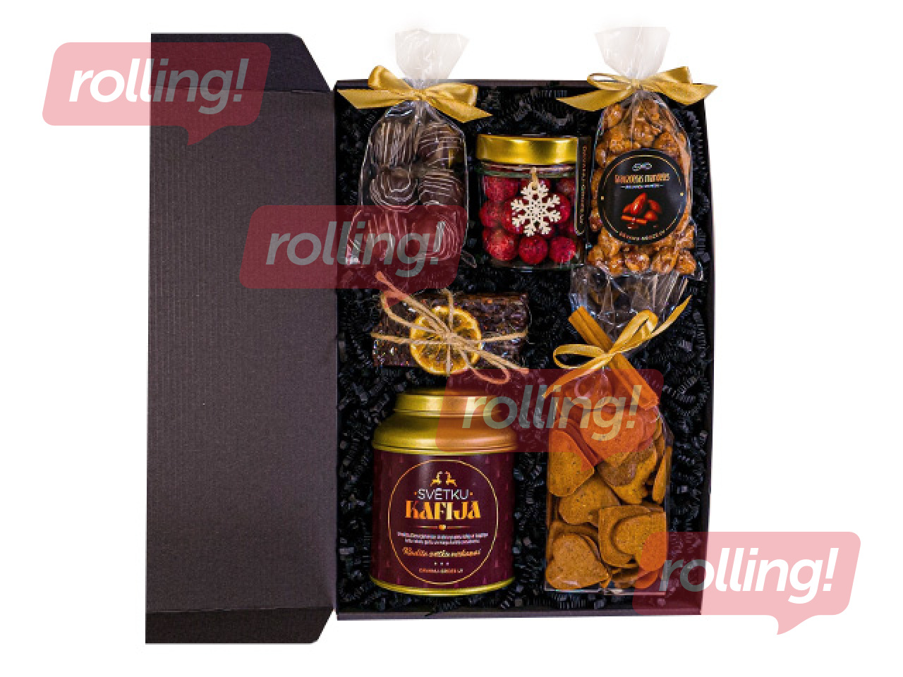 Rikkalik maiuste valik, mis rõõmustab erinevate maitsetega – alates aromaatsest pidulikust kohvist ja krõbedatest piparkookidest kuni tumeda šokolaadiga kaetud martsipani ja jõuluhõrgutisteni. See kingitus on peen tervitus, mis lisab pühadele erilist võlu.