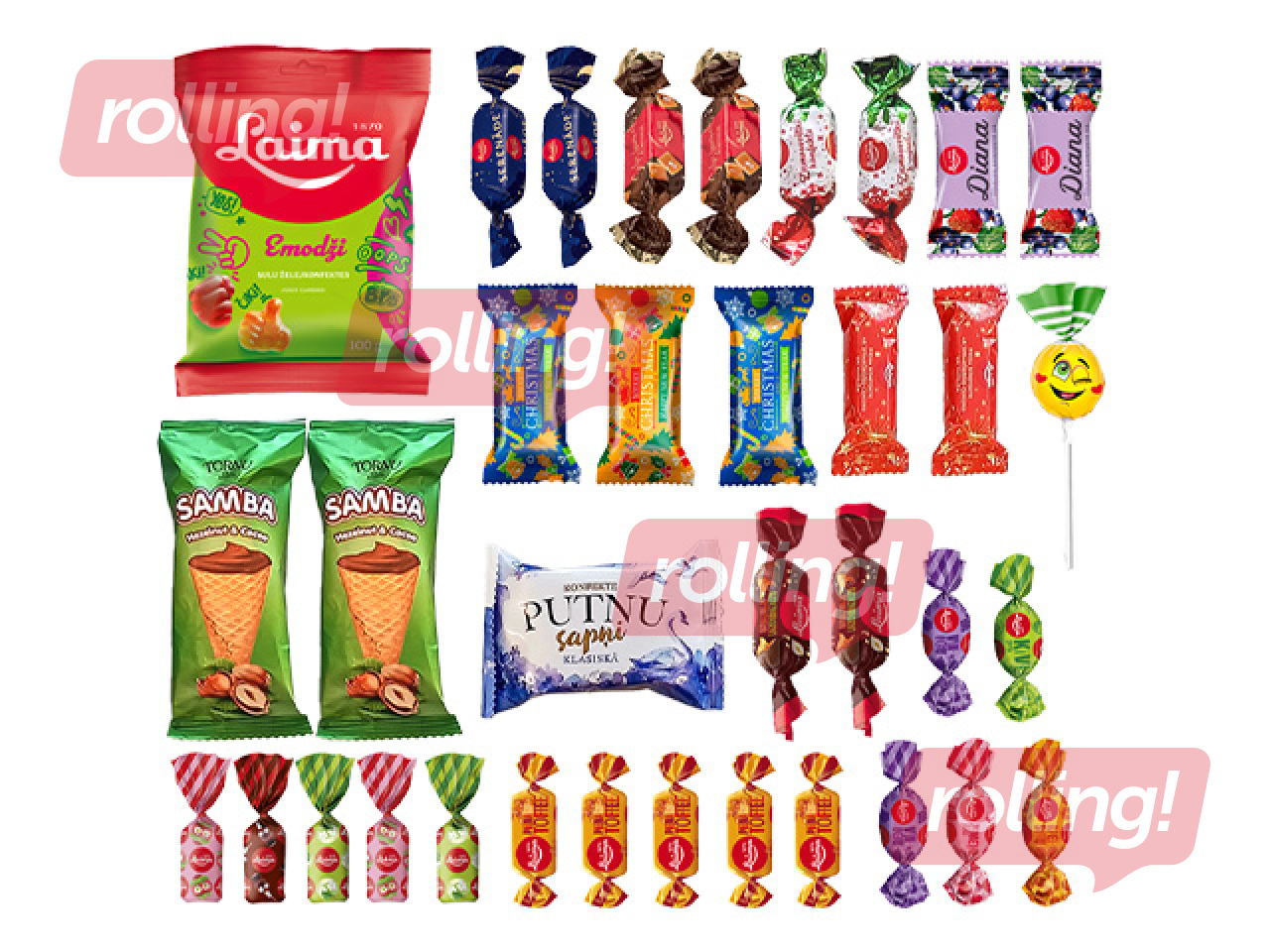 Laima šokolaadikommid: Serenāde, Braunijs, Diana, Ziemassvētku, soolakaramelliga, piimakomm vahvlite ja praksuva suhkruga