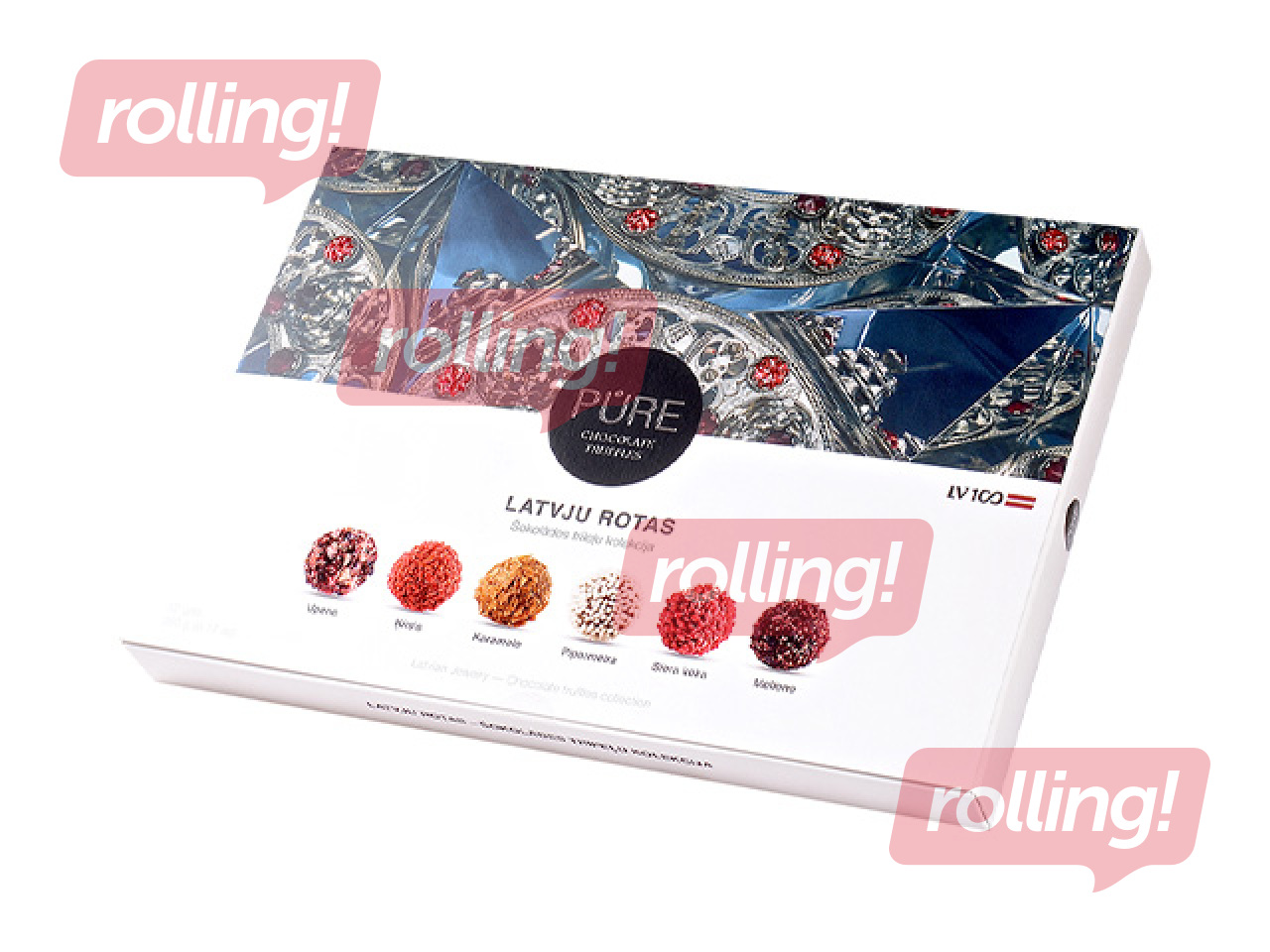 Peen piima- ja tumeda šokolaadi trühvlite kollektsioon „Läti ehted“. Piimašokolaadi trühvlid juustukoogi maitselise kreemitäidise ja vaarikadekooriga, karamellikreemi ja vahvlidekooriga, kirsikreemi ja kirsikaunistusega, mustsõstrakreemi ja mustsõstradekooriga, mustikakreemi ja mustikadekooriga ning šokolaaditrühvlid piparmündikreemitäidise ja riisidekooriga.