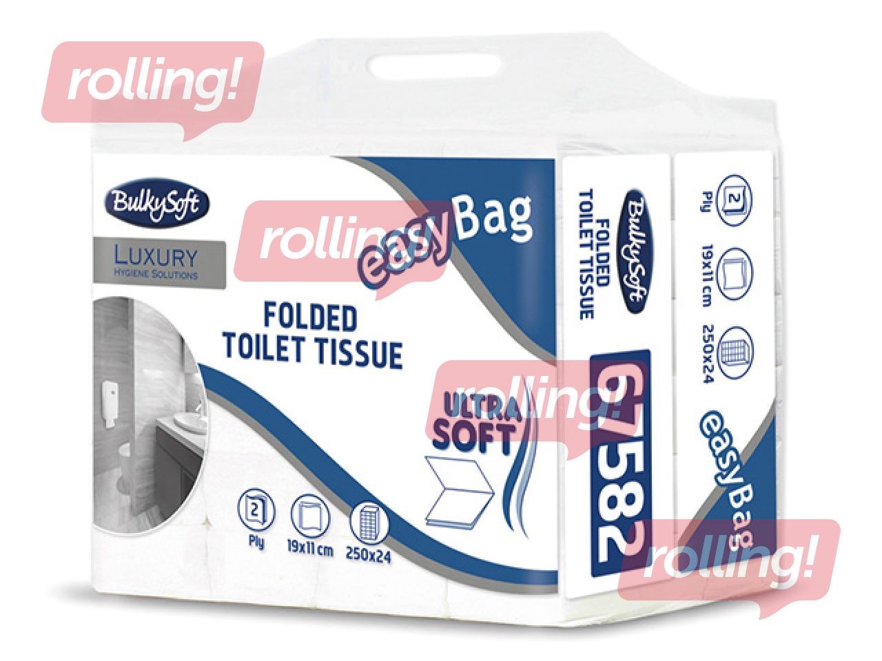 Bulkysoft Luxury kahekihiline tualettpaber lehtedena tagab mugavuse ja ohutu kasutamise. Valget värvi, praktilistes pakendites, sobib intensiivseks igapäevaseks kasutamiseks. Lahustub vees kiiresti – umbes 10 sekundi jooksul, vähendades kanalisatsiooni ummistumise riski.