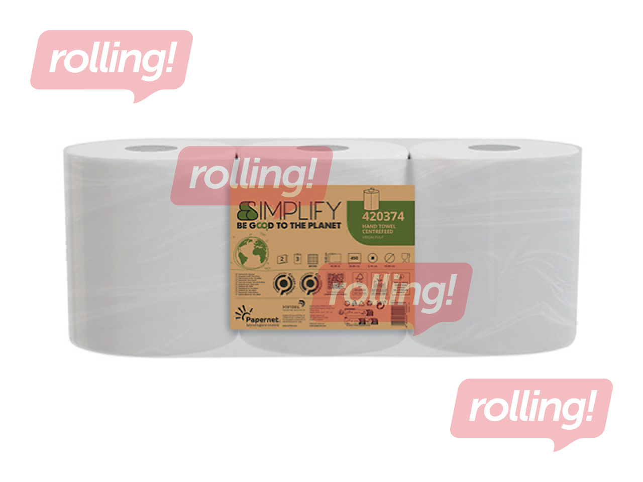 Papernet Simplify Centerfeed paberkäterätid on valmistatud 100% tselluloosist, tagades suurepärase kvaliteedi ja väga hea imavuse. Iga valge rull on vastupidava 2-kihilise struktuuriga ning sisaldab 450 lehte kogupikkusega 90m. Toode on mõeldud professionaalseks kasutamiseks, sobib kokkupuutesse toiduga ning omab keskkonnasertifikaate. Pakendis on 3 rulli, mis sobivad standardsetele M2 kesklahtijaoturitele.