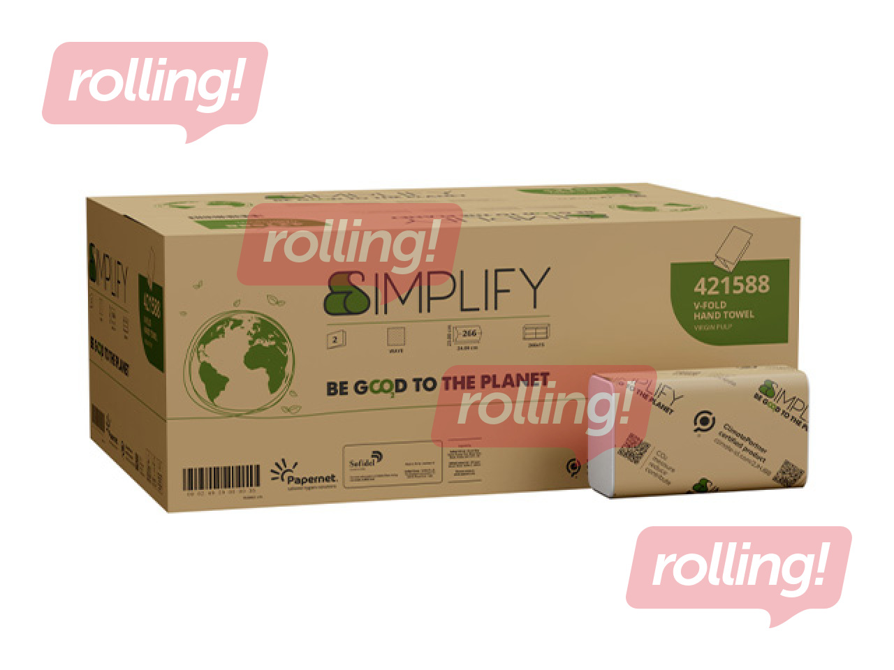 Simplify sarja V-volditud paberkäterätid pakuvad tõhusat ja keskkonnasäästlikku lahendust käte kuivatamiseks. Valged 2-kihilised lehed tagavad suurepärase imavuse ja vastupidavuse kasutamisel. Igas pakis on 266 lehte ning kastis 15 pakki, mistõttu sobib toode keskmise ja suure külastatavusega aladele.