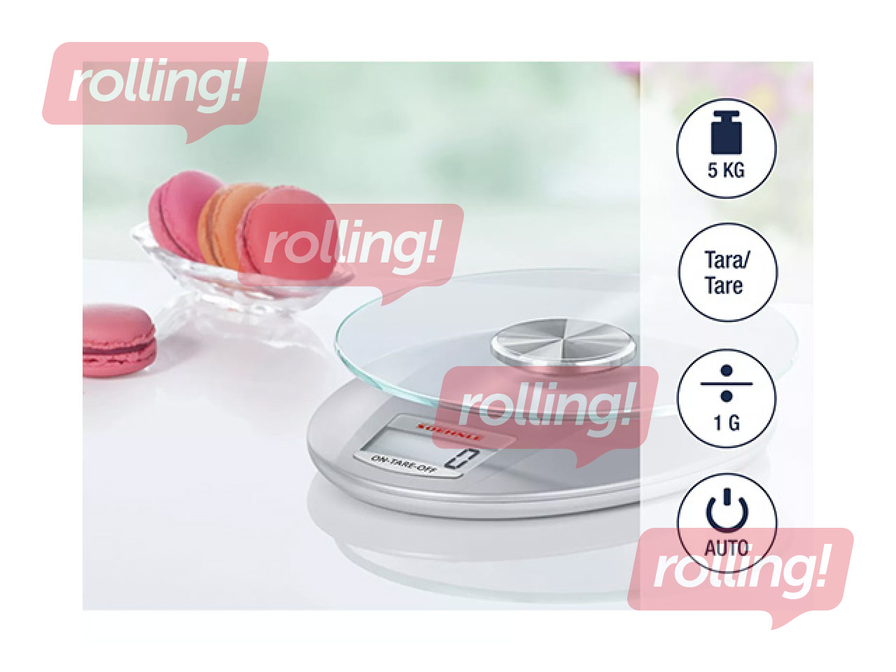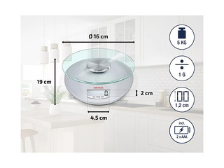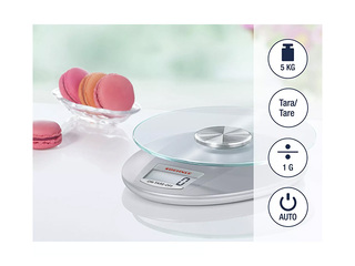 Elektrooniline köögikaal Soehnle Roma Silver on digitaalne kaal maksimaalse kandevõimega kuni 5kg ja täpsusega 1g, sobides koostisosade mõõtmiseks toiduvalmistamisel ja küpsetamisel. Kaal on varustatud eemaldatava turvaklaasist kaalumisplaadiga, suure LCD-ekraaniga ja taarafunktsiooniga, mis võimaldab kaaluda mitu koostisosa ühes anumas. Automaatne väljalülitus aitab säästa energiat ning mõõtühikute vahetamine grammide ja untside vahel tagab mugava ja täpse kaalumise igapäevases köögis.