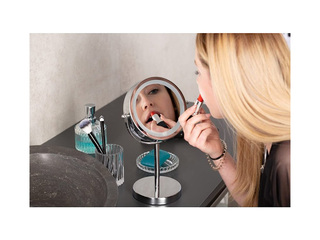 See on kahepoolne, ühe tavalise ja teise 3× suurendusega peeglipinnaga, ning varustatud LED-valgustusega (töötab 4×AAA patareidega, ei kuulu komplekti). Peegel on vabalt seisev stabiilse alusega, valmistatud kvaliteetsest kroomitud terasest, ning selle mõõt on Ø20×35cm, sobides ideaalselt kasutamiseks laual või vannitoas.