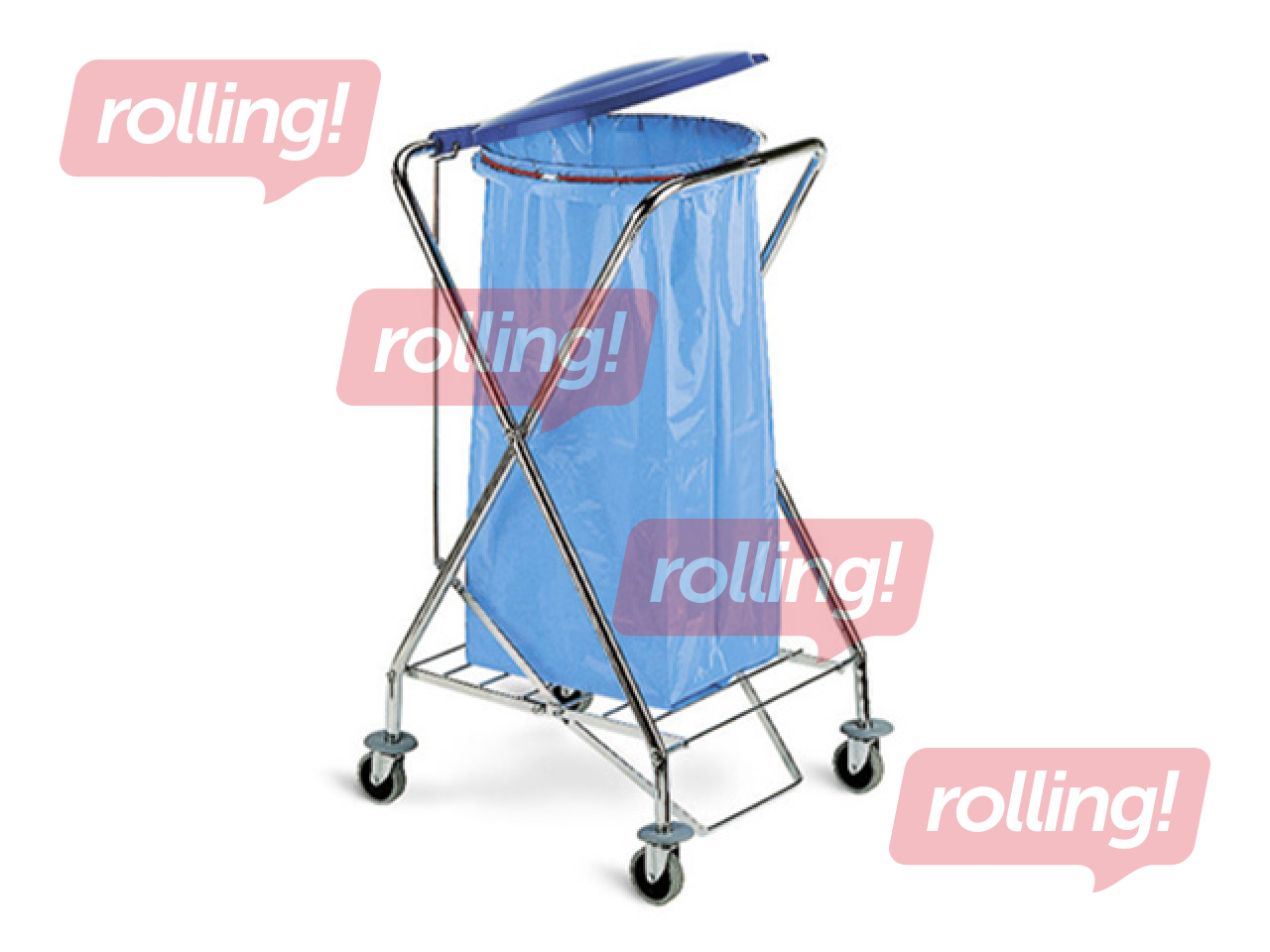 Kroomitud prügikotihoidik pedaali ja sinise kaanega, mõeldud kasutamiseks välistingimustes.
