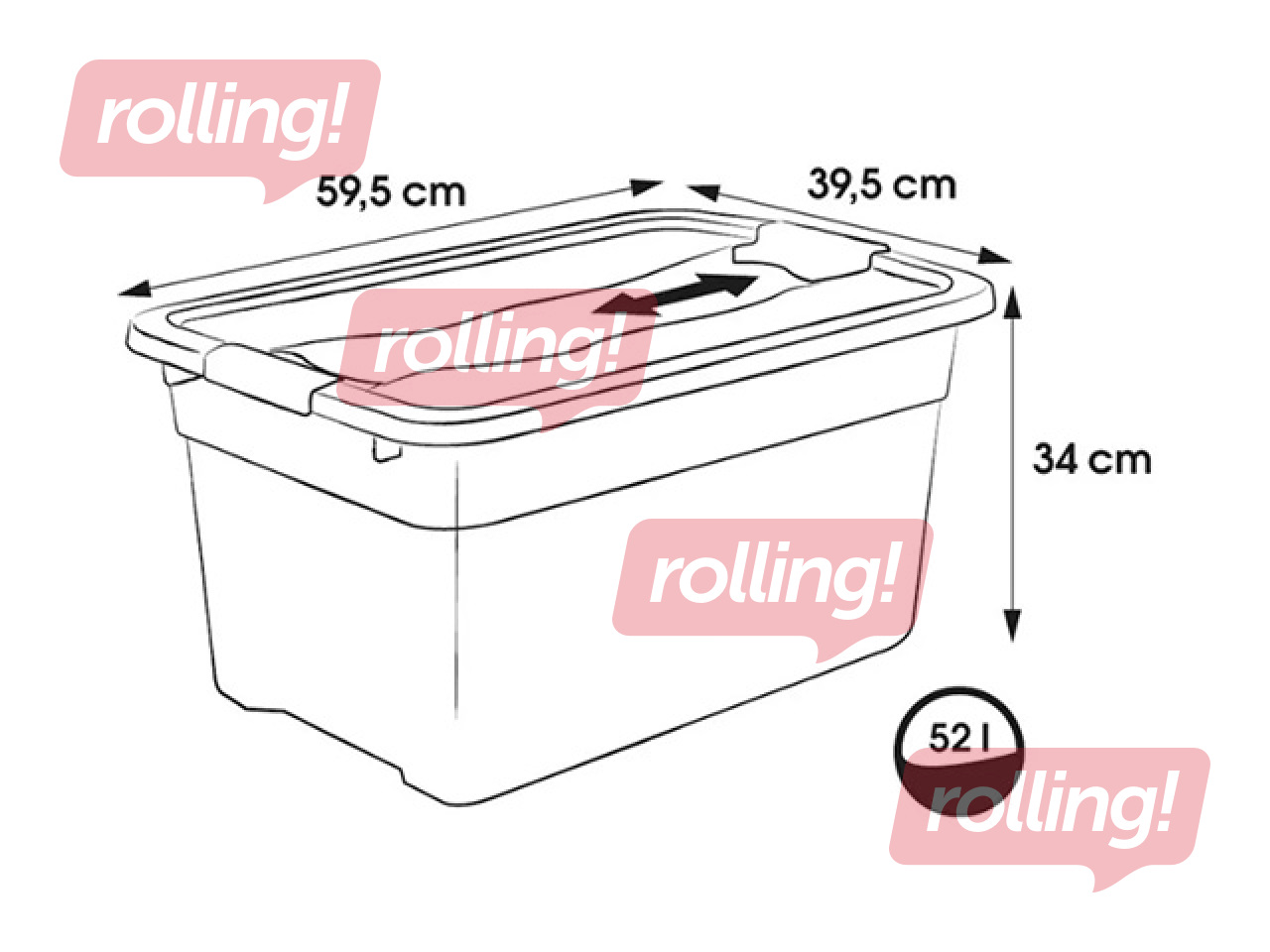 Kast on varustatud kaanega külgmiste lukustusklambritega, mis sulgevad kasti kindlalt ja kaitsevad sisu tolmu eest, ning sobib turvaliseks ladumiseks mitmesse kihti. Maht 52l, ligikaudsed mõõdud 59.5×39.5×34cm.