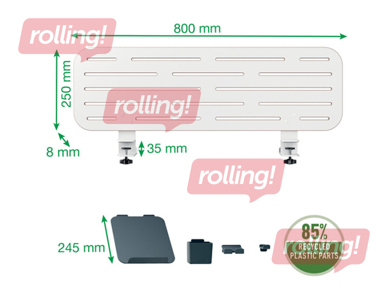 Kaasas on neli korralikku lauatarvikut, mis kõik on valmistatud 85% tarbimisjärgselt taaskasutatud plastist. 1 x sülearvutihoidik (sobib ka MacBookidele), 1 x nutitelefoni hoidik, 1 x pliiatsihoidja ja 1 x riputuskonks peakomplekti jaoks.