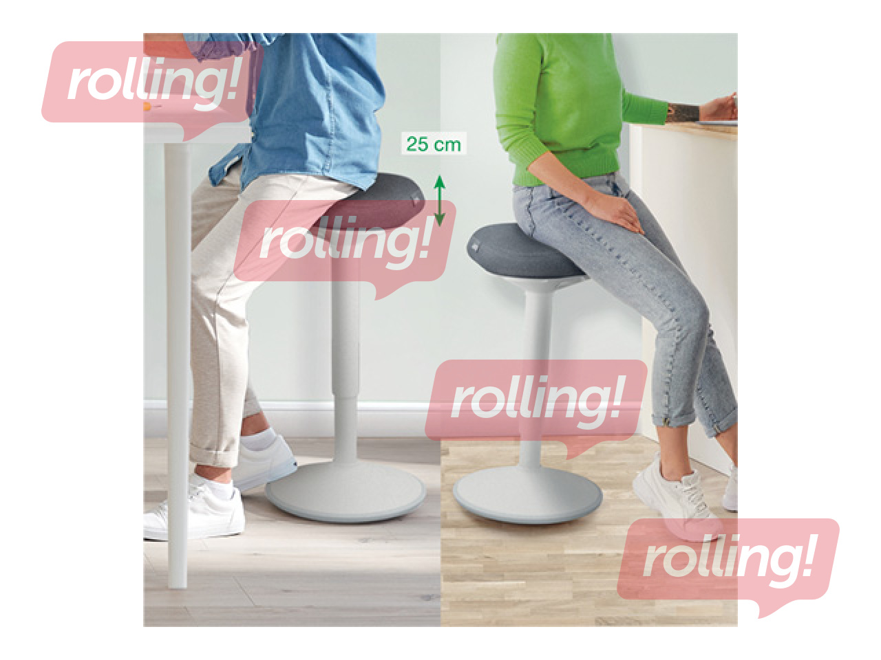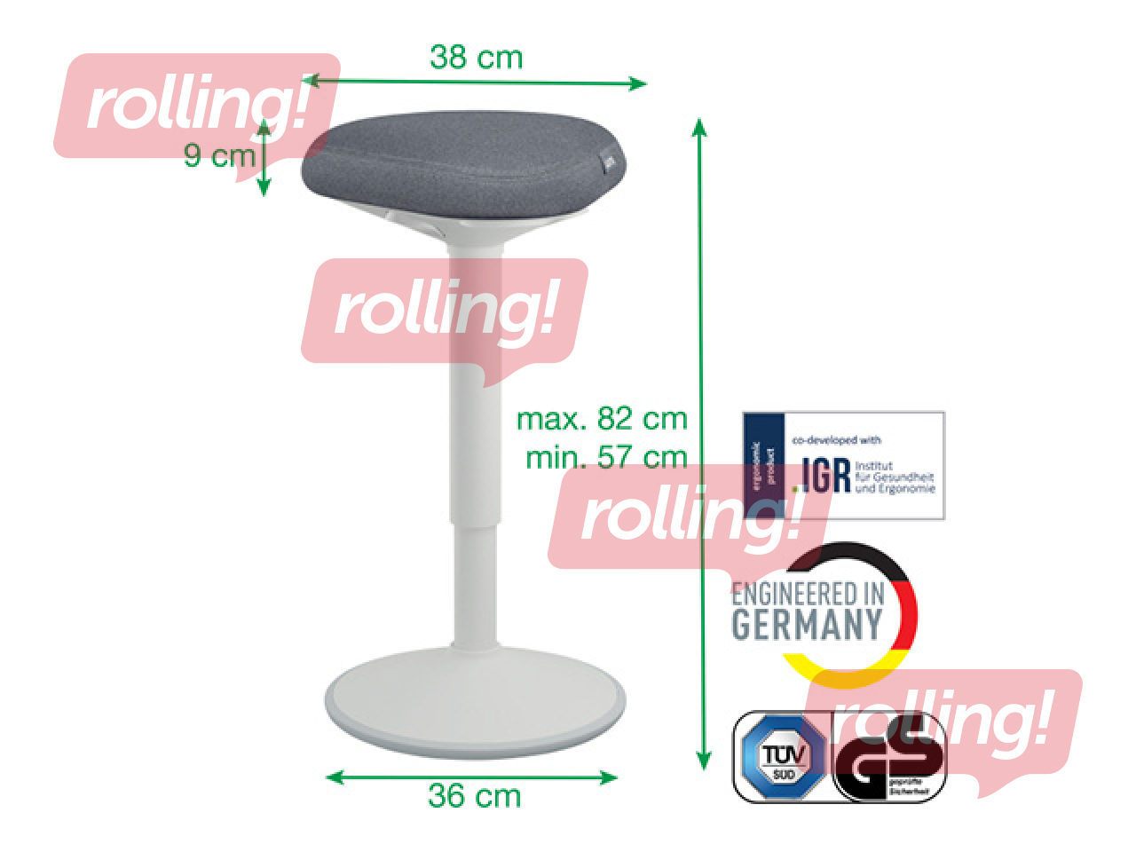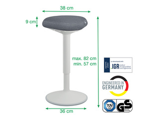 Sujuv ja lihtne 25 cm pneumaatiline kõrguse reguleerimise ulatus (57-82cm) nupu vajutusega istumispinna all, et seada ideaalne seismise toetuskõrgus.