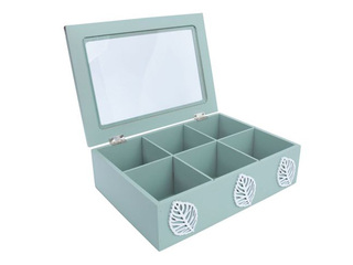Teekarp Hazel on mõeldud teepakkide või lahtise tee korrastatud hoiustamiseks kodus või kontoriköögis, ühendades praktilise kasutuse rahuliku ja neutraalse disainiga. MDF-materjalist valmistatud karp klaasist kaanega tagab sisu hea nähtavuse, samas kui roheline toon lisab interjöörile tasakaalustatud aktsendi. Mõõdud 24×17×7.5cm võimaldavad selle mugavat paigutamist riiulile või lauale.