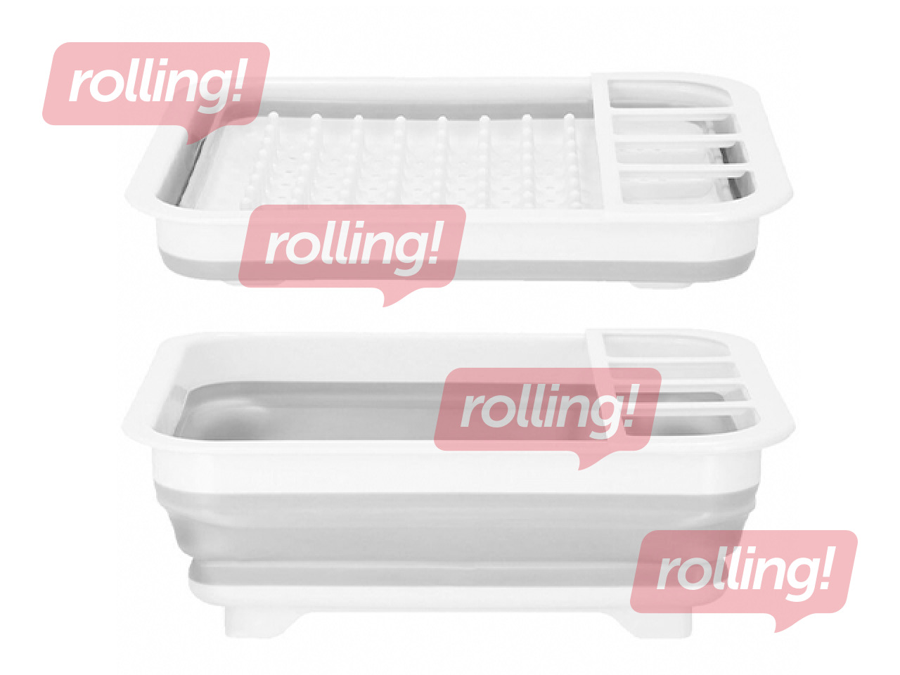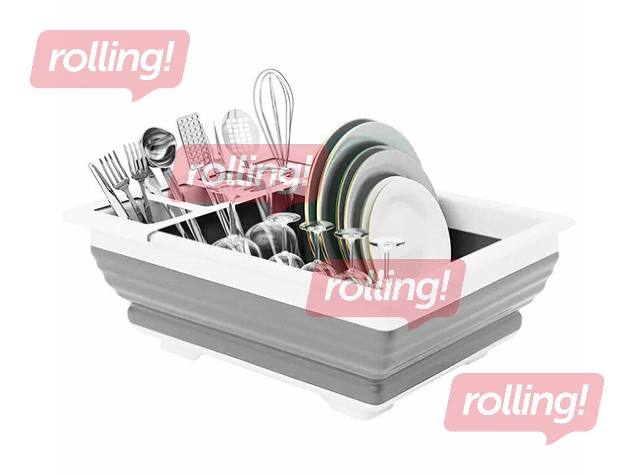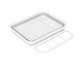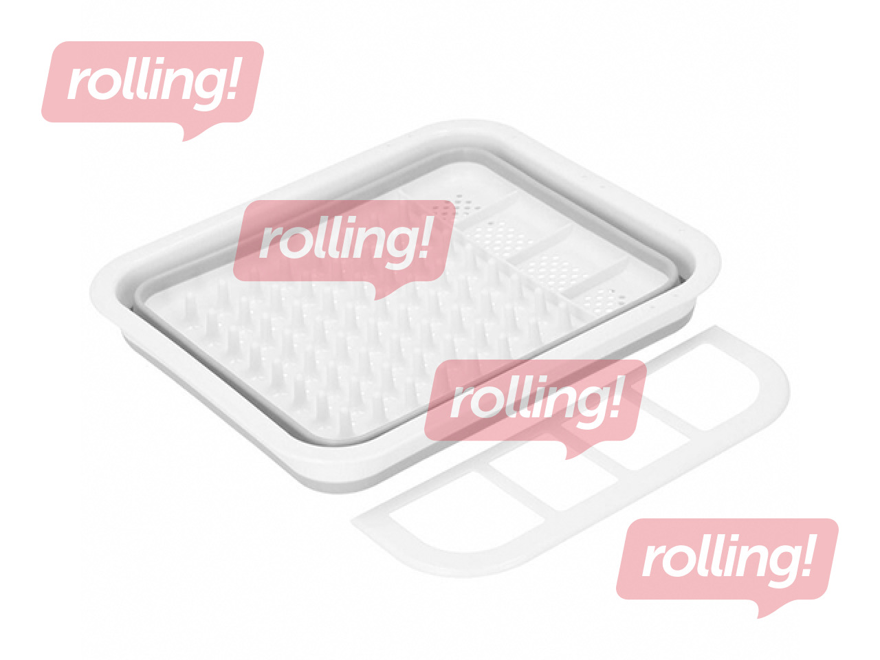 See on valmistatud vastupidavast plastikust helehalli ja valge värvikombinatsiooniga ning varustatud mitme sektsiooniga korrastatud nõude paigutamiseks.